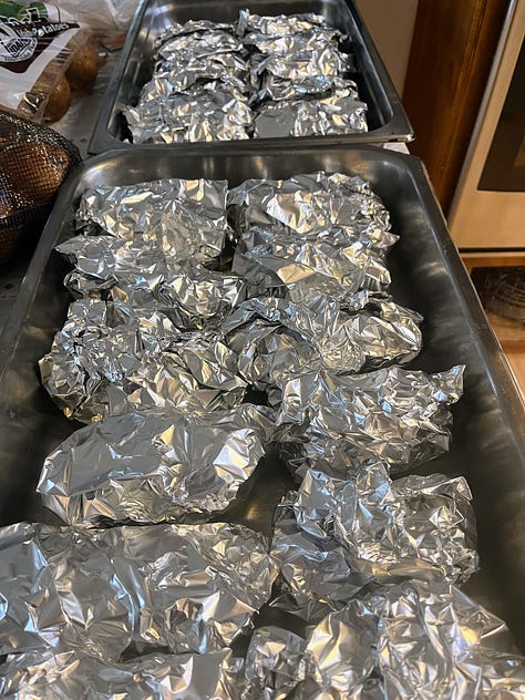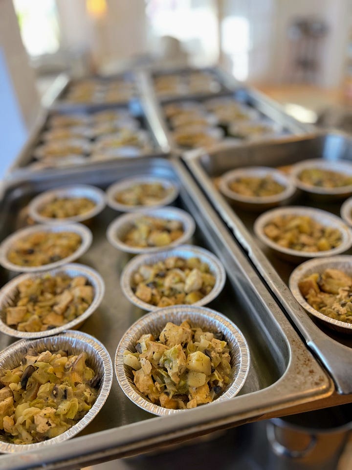 I made and froze all of the main dishes in advance. I found some high quality heavy weight stock pots at an estate sale for $15 a piece, borrowed hotel pans, cambros, and a huge cooler from a restaurateur in town to transport food, and started in on a 5-day cooking marathon to make the supper entrées.