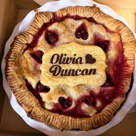 I invited D&O over for supper, set my three books out on the table, and sketched out a menu. We picked out supper entrées from Home Cooking, pies from Art of the Pie, and a special crumble that I had created for Olivia from Pie Camp. Good thoughts and blessings for their life together would be put in to everything. Then I began.