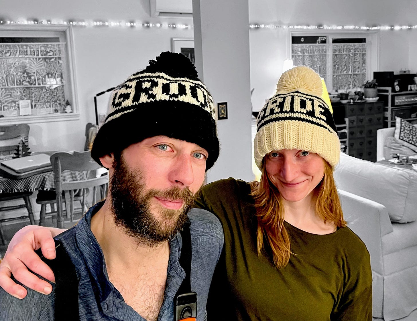 A few days before Christmas, Duncan and Olivia texted asking if I might be free for cocktails. Sure, I responded. I set some nibbles on the counter, brought out some glasses and a few bottles to make drinks, and over they came. There was a pile of snow outside on the back deck so it didn’t seem out of the ordinary that they kept their pompom topped knit hats on but it took me a while to register what was knit into the hat edges. When I read the words, Bride and Groom, I couldn’t have been happier and literally started jumping up and down!